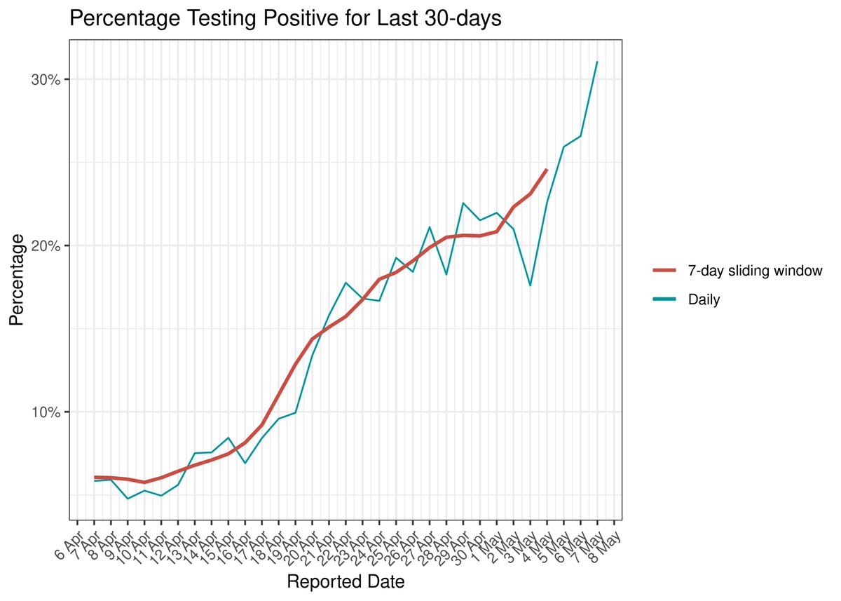 Test positivity ratio (and infections) is on a very upward trajectory in South Africa. Positivity ratio is as high as at the peak of the other waves.