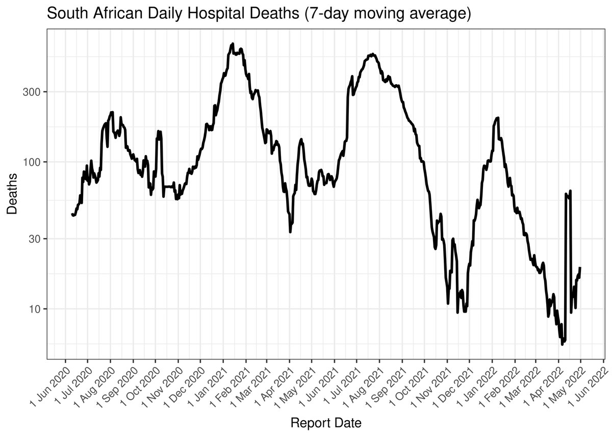 Despite the increase in the percentage of genomes, BA.4 and BA.5 are not causing a spike in infections in SA. The same is seem for hospitalization and deaths, which SA is at a record low.