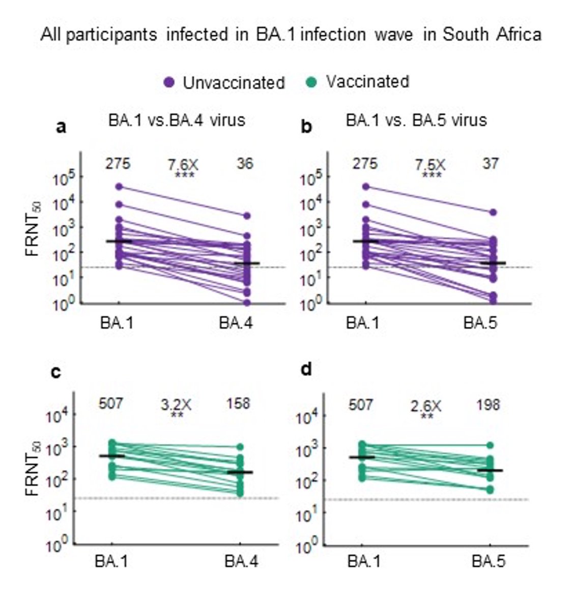 Omicron BA.4 and BA.5 do break easily through immunity of previous BA.1 infections, but less in hybrid immunity (vaccination & previous infections). If South Africa, and other countries, want to stop waves we need to increase vaccination & boost also previously infected