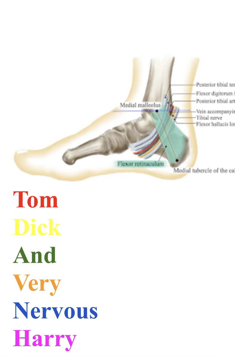 3) Structures that sit within the TT are; tibialis posterior, FDL, posterior tibial artery & vein, tibial nerve and the FHL. A useful pneumonic for this is - ‘Tom, Dick And Very Nervous Harry’.