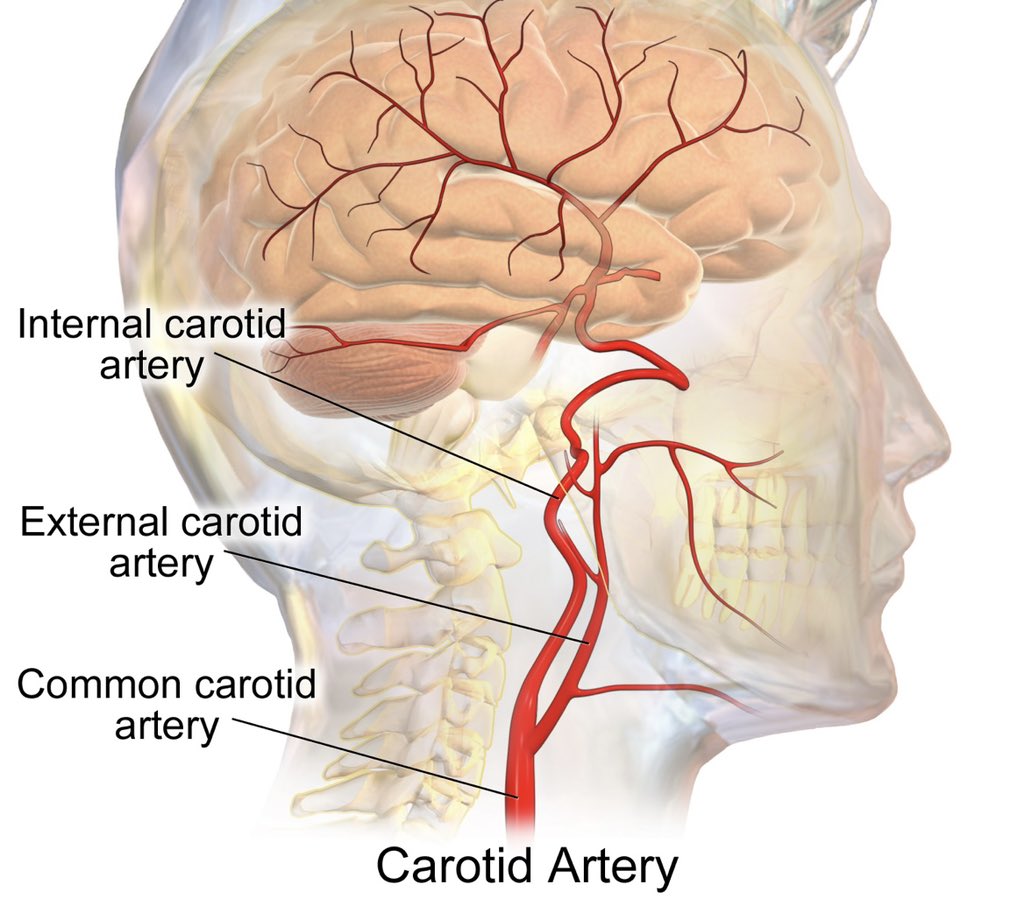 2) A dissection of either the carotid/vertebral arteries. The carotid arteries are positioned around the front of the neck whilst the vertebral are posterior. Their incidence is low (2.6 per 100k) but it is the most common cause of ischaemic stroke in <50’s (Debette & Leys 2009).