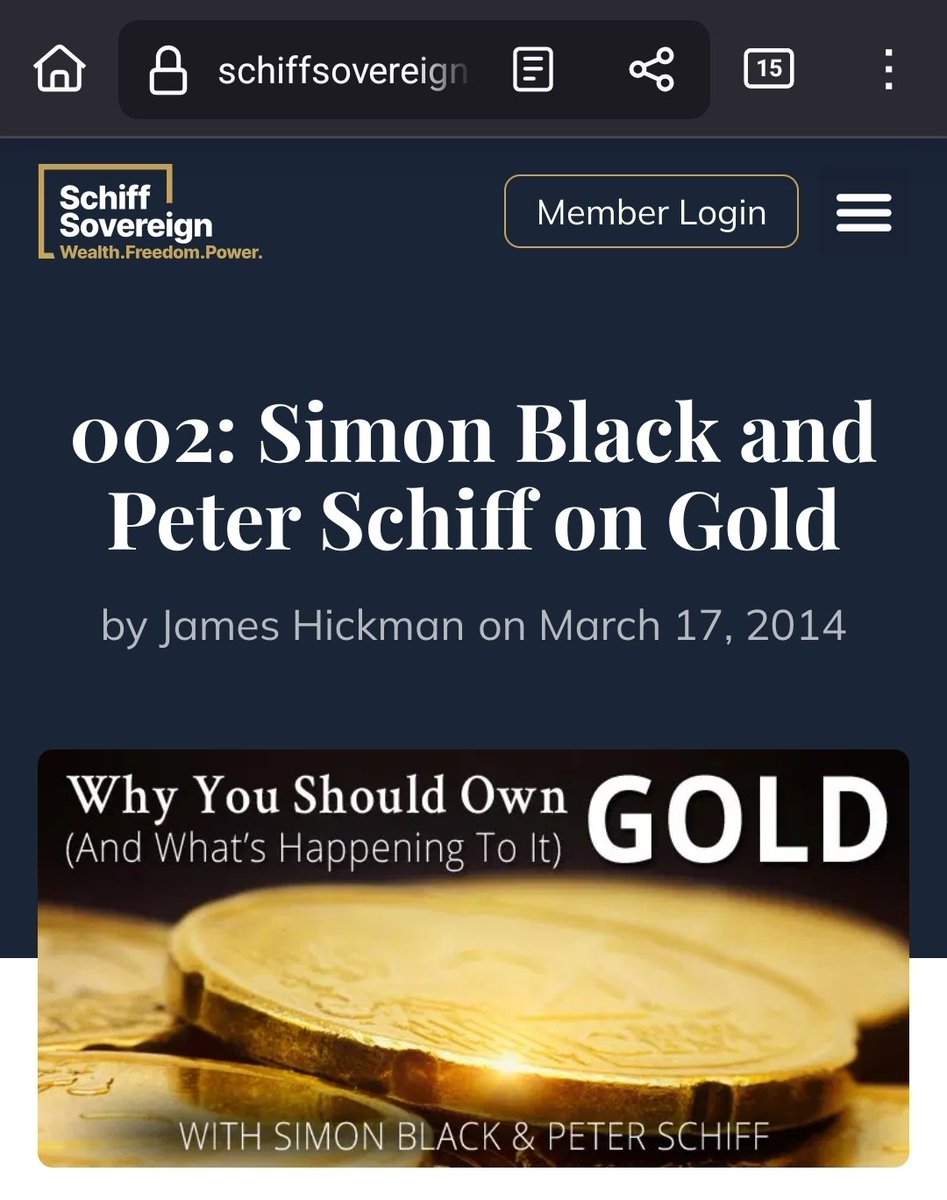 They began appearing together publicly in 2014, with a Sovereign Man podcast (episode #2) released on March 17, 2014, titled “Simon Black and Peter Schiff on Gold”.