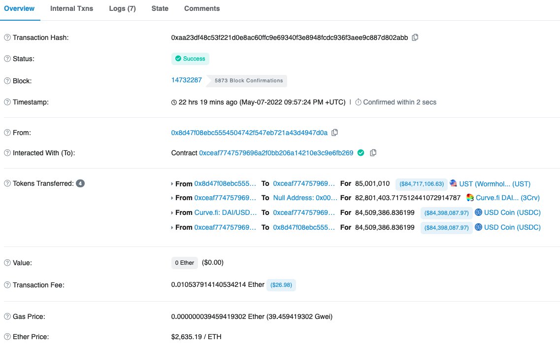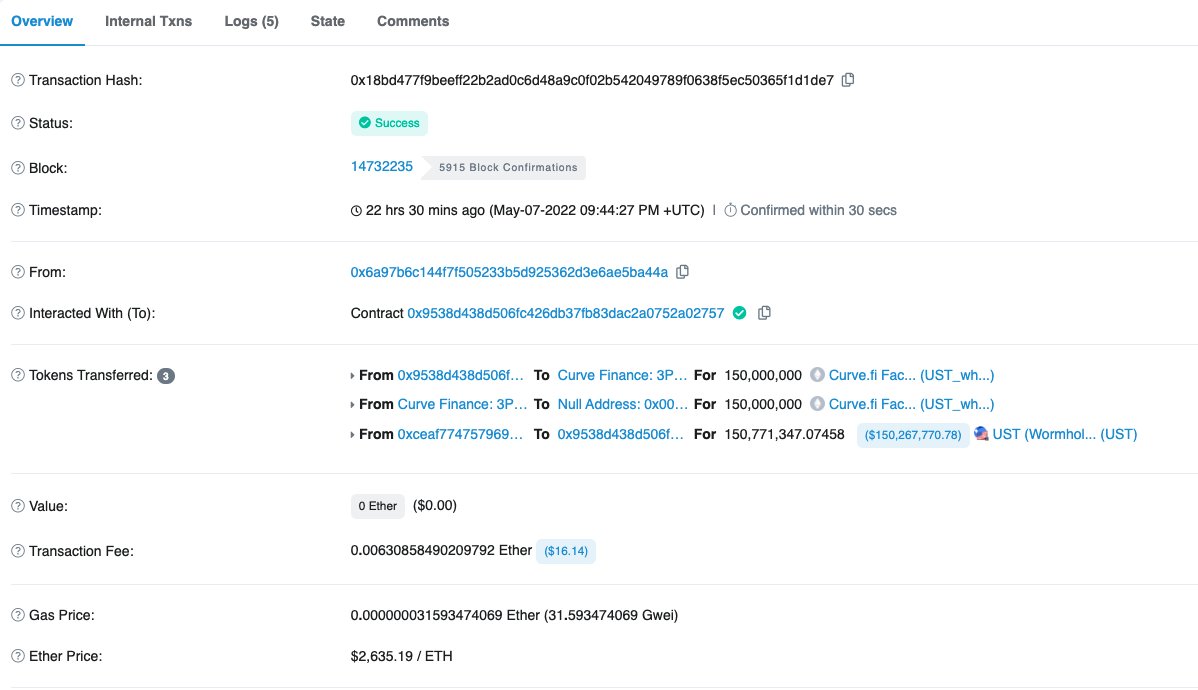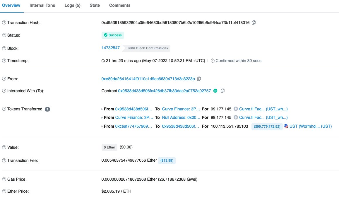 7/13 Terra geliştiricisi Terraform Labs, Curve likidite havuzlarından önce 150 milyon UST çekti sonra da 100 milyon dolar UST