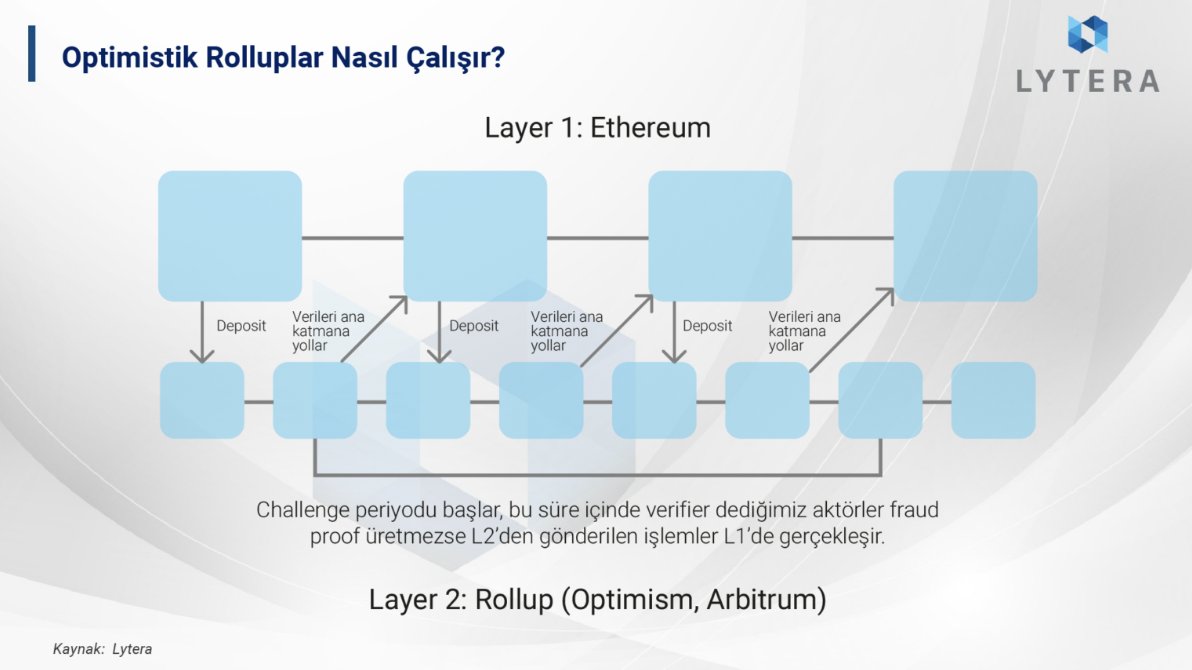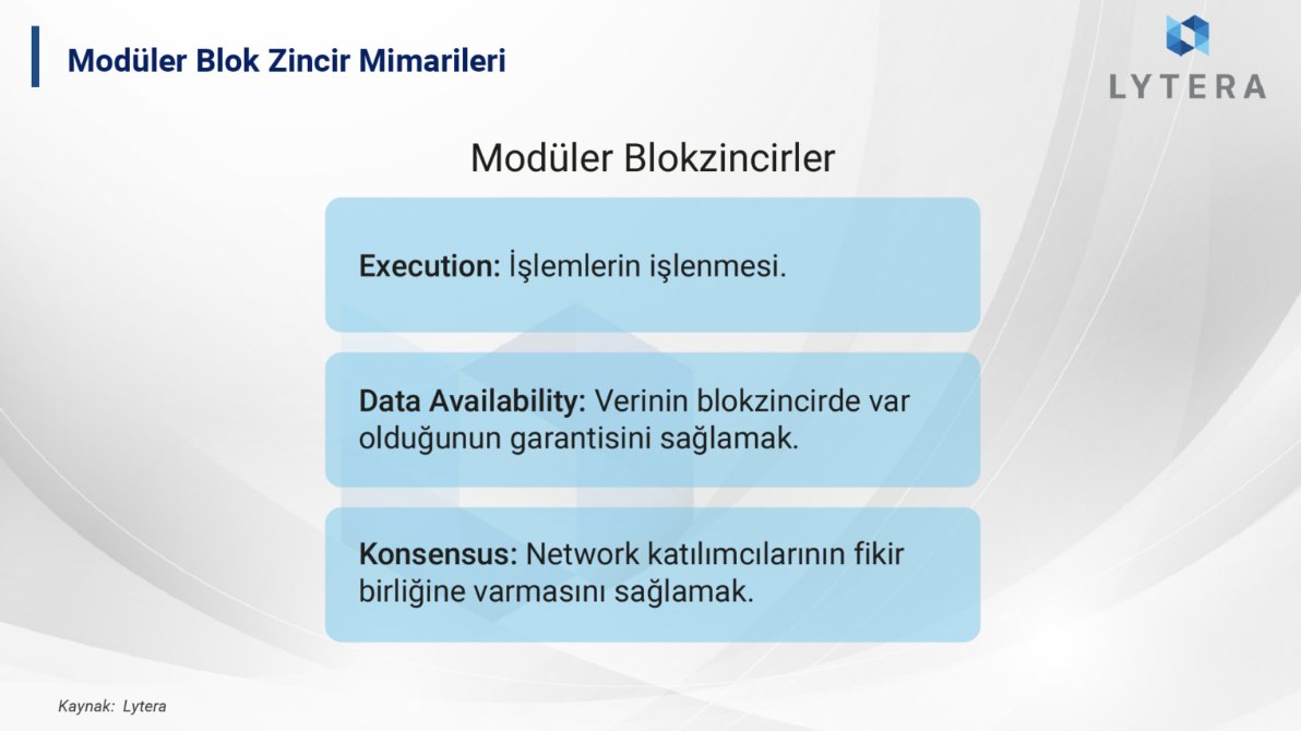 3/15 İşlemler, yürütme katmanları tarafından (Örn. rolluplar) işlenir. Bu işlemler verileri, veri erişilebilirliğini sağlayan zincire gönderir. Veri erişilebilirliğini sağlayan zincirin başlıca rolü, verinin zincirde olduğunun ve değiştirilemezliğinin garantisini sağlamak.