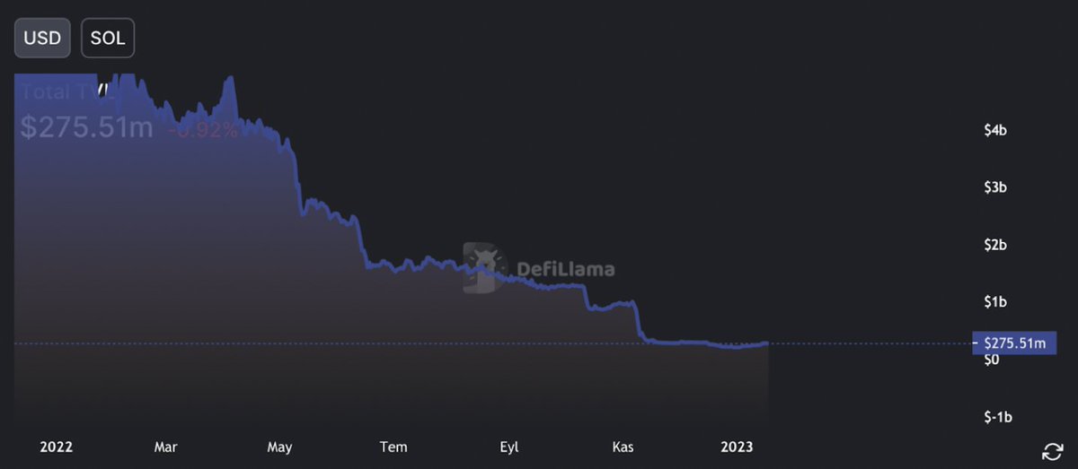 2/10 Solana ağındaki toplam kilitli varlık değerinin, @DefiLlama'nın verileri incelendiğinde 275 milyon dolar seviyelerinde olduğu görünüyor.