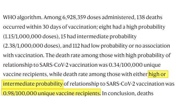 8 Todesfälle mit "hoher Wahrscheinlichkeit" durch Impfung = 0,34/100.000 Geimpfte