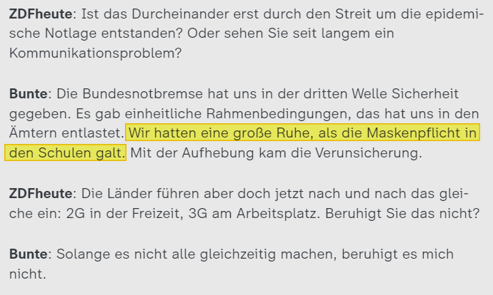 Für sie war z.B. die Maskenpflicht in Schulen nötig, weil diese "Ruhe" brachte.