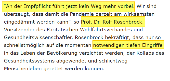 Auch Herr Rolf Rosenbrock, Vorsitzender des Paritätischen Wohlfahrtsverbandes, hat bereits öffentlich verkündet, dass die "tiefen Eingriffe" in unser Leben "notwendig" gewesen seien (und natürlich nur durch eine allgemeine Impfpflicht zu beenden wären)