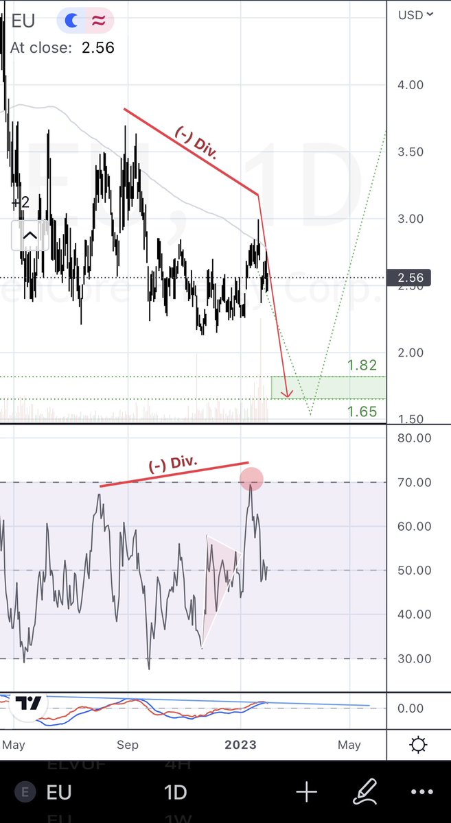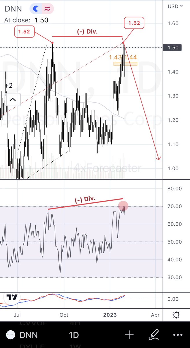Here is another illustration from $DNN, where a (-) Div would still work (i.e.: RSI highs vs lower price spikes), even in the even that a price carves a perfect double-top (here at 1.52).