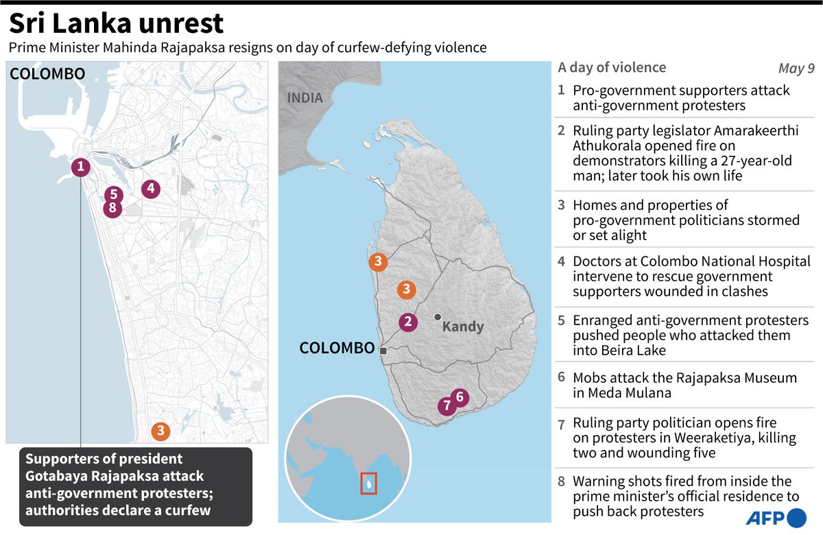 #AFPgraphics factfile on unrest in Sri Lanka on May 9 after supporters of the president attacked anti-government protesters and authorities declared a curfew