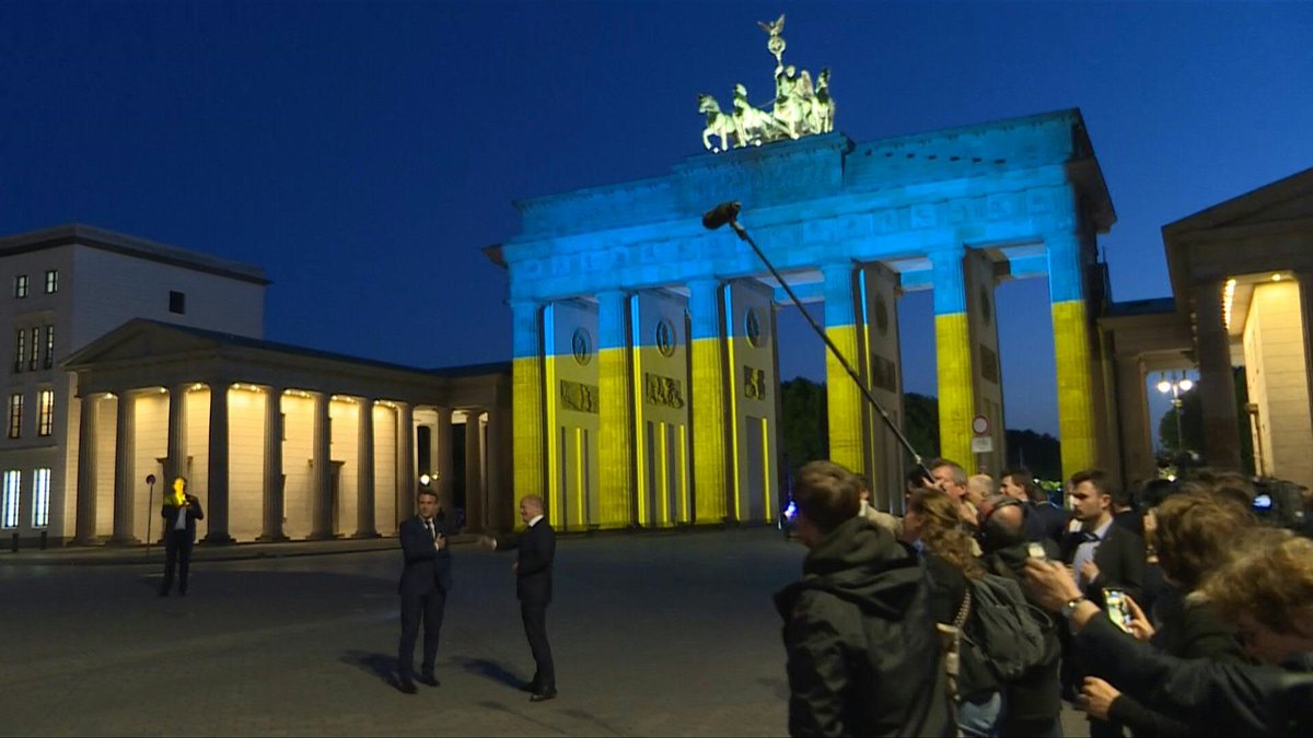 VIDEO: French President Emmanuel Macron and German Chancellor Olaf Scholz visit Berlin's symbolically important Brandenburg Gate, which is illuminated in Ukraine's national colours