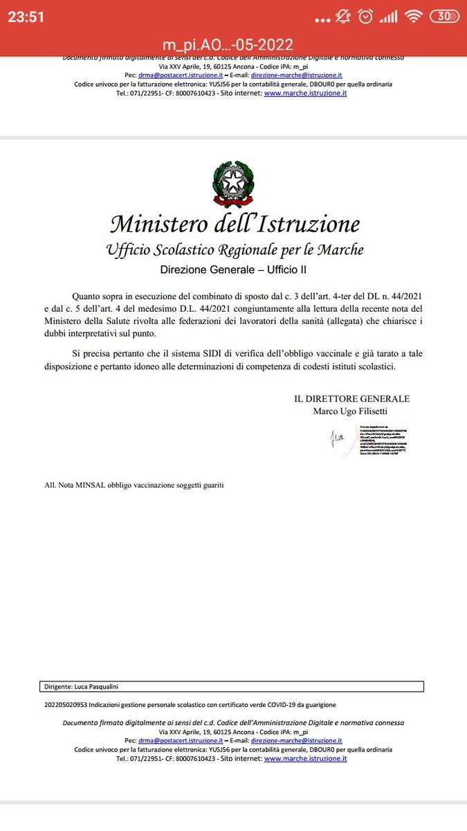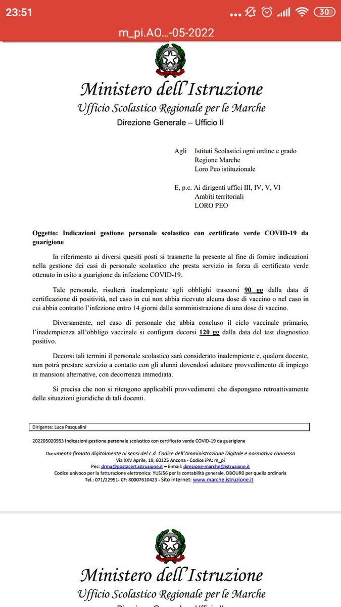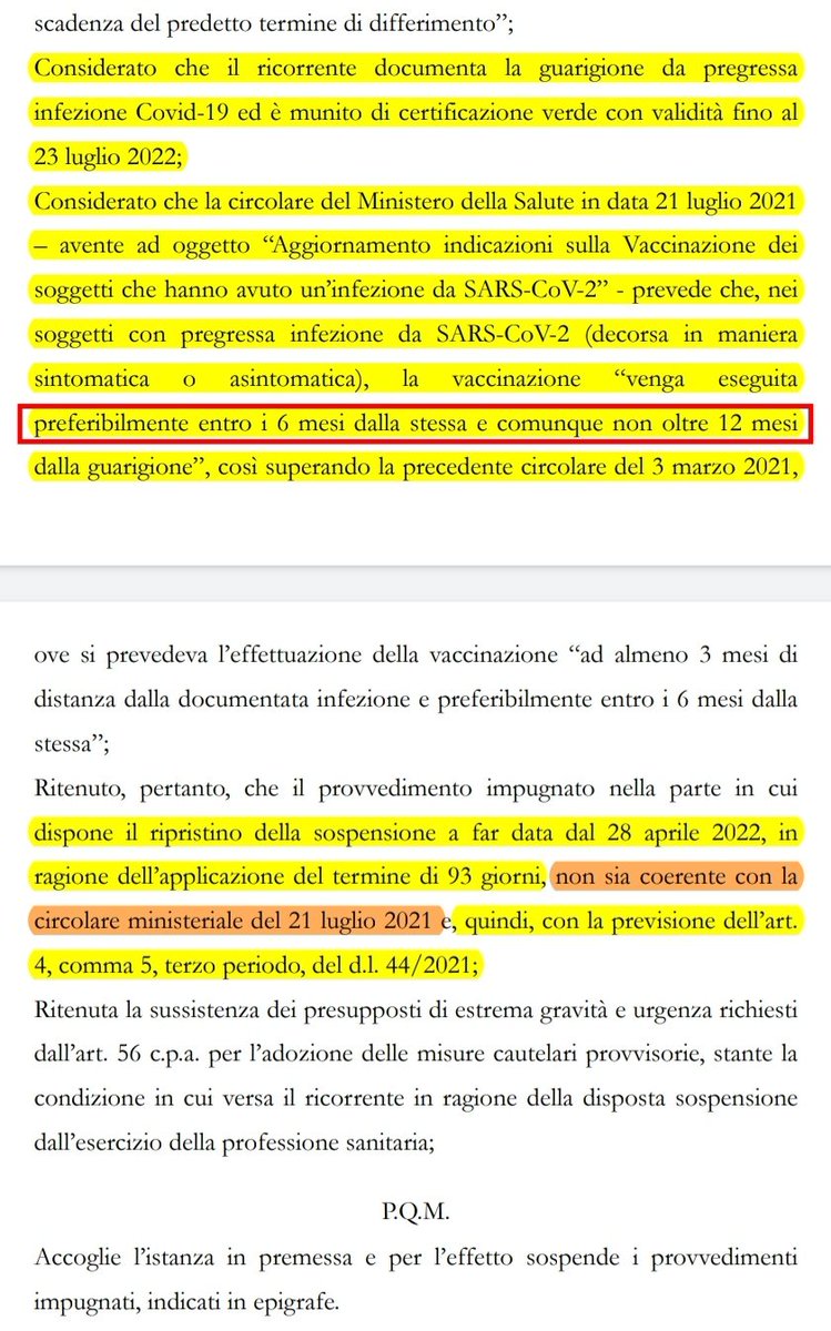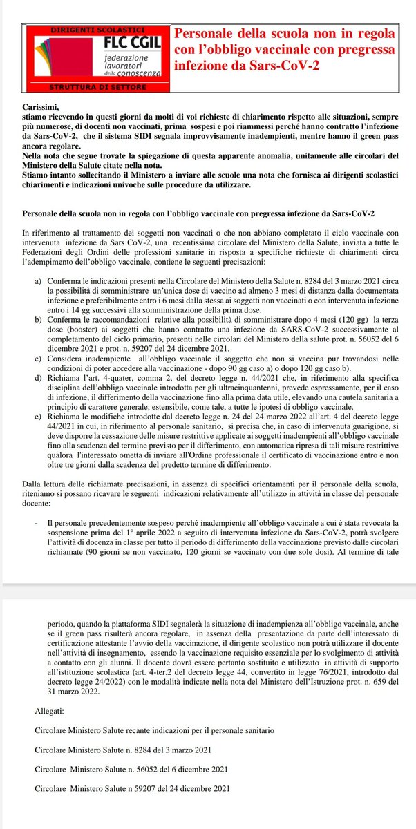 Le circolari del Ministero della Salute sono richiamate nel DL 44/2021 sull'obbligo vaccinale (e ss. mm. e ii.). E l'ultima circolare applicabile ai guariti da CoViD non ancora vaccinati è chiara nell'affermare che ci si può vaccinare entro 12 mesi.