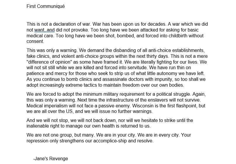 This is the full statement from the far-left group claiming responsibility for the arson attack on a pro-life group in Wisconsin.