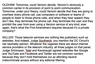 On the Verizon point, there was a whole lot of yammering about past net neutrality litigation that should have produced an easy answer to this but somehow they never got there. The answer being, websites are not regarded as common carriers