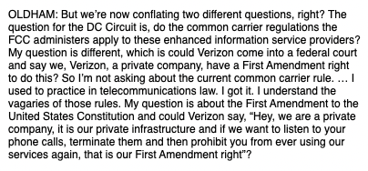And here's the exchange on Verizon. As I understand it, the reason Verizon cannot do what Oldham is proposing — and yet Twitter can — is precisely because Verizon has common carrier obligations in its phone business (but not its broadband business!) and Twitter does not.