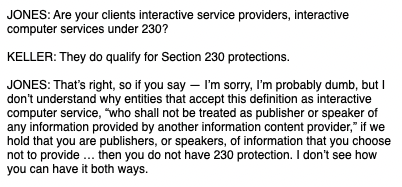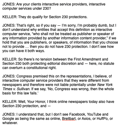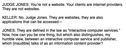 And here is the exchange on whether Twitter is even a website at all, and if it is, whether it is covered by Section 230.