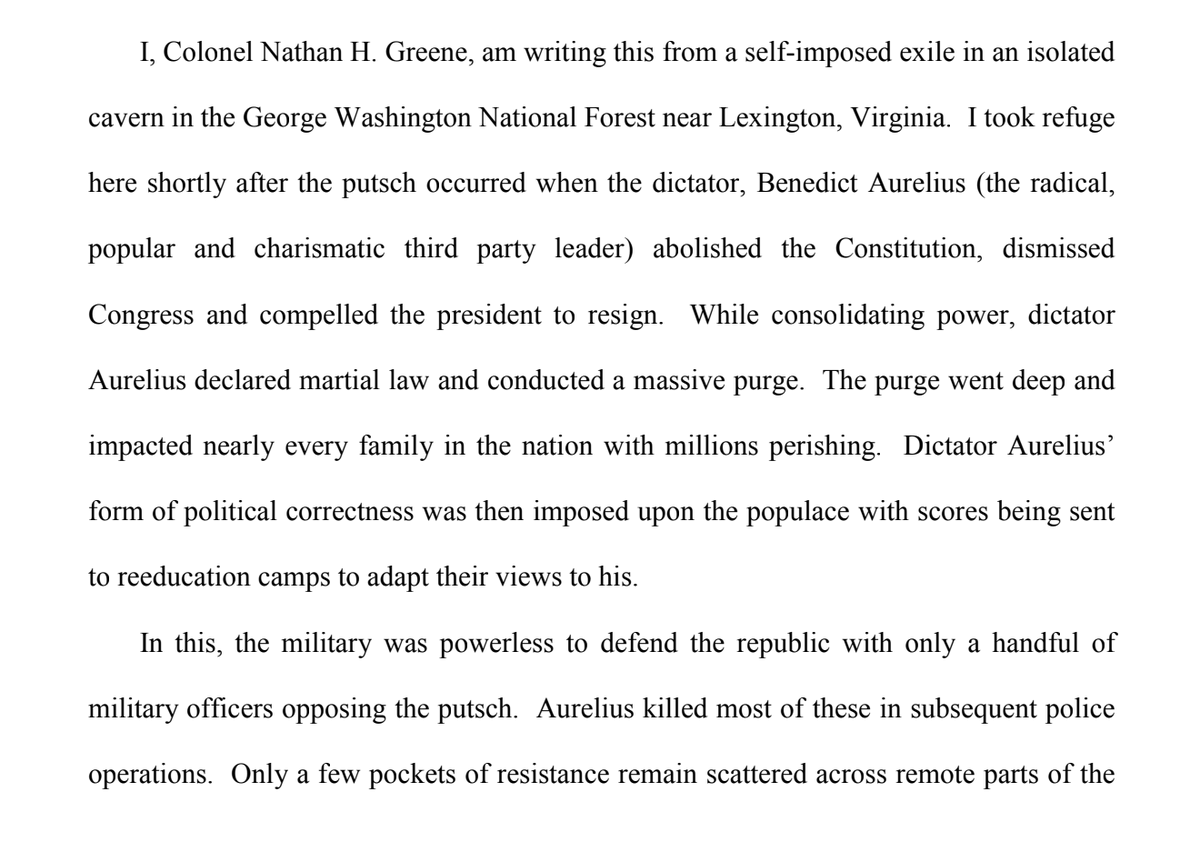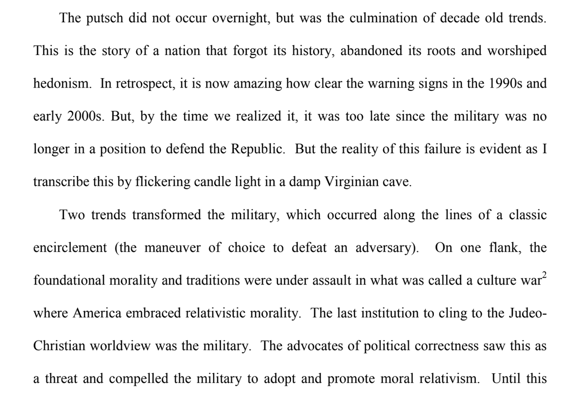 Mastriano's thesis is literally a fantasy: he imagines himself a refugee after a putsch has dismissed Congress, declared martial law. It's unhinged by any standards but especially creepy after January 6. You can read it too at link. 7/ apps.dtic.mil/dtic/tr/fullte…