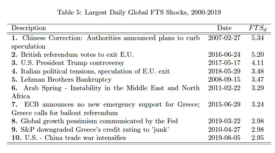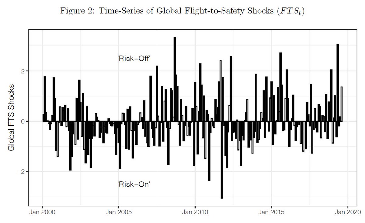 By defining a global FTS as occurring on days when: Equity prices and UST yields drop + volatility and credit spreads rise + FX carry unwinds - all at the same time - I can aggregate info across asset classes to arrive at a series of global FTS shocks (details in the paper) 3/n