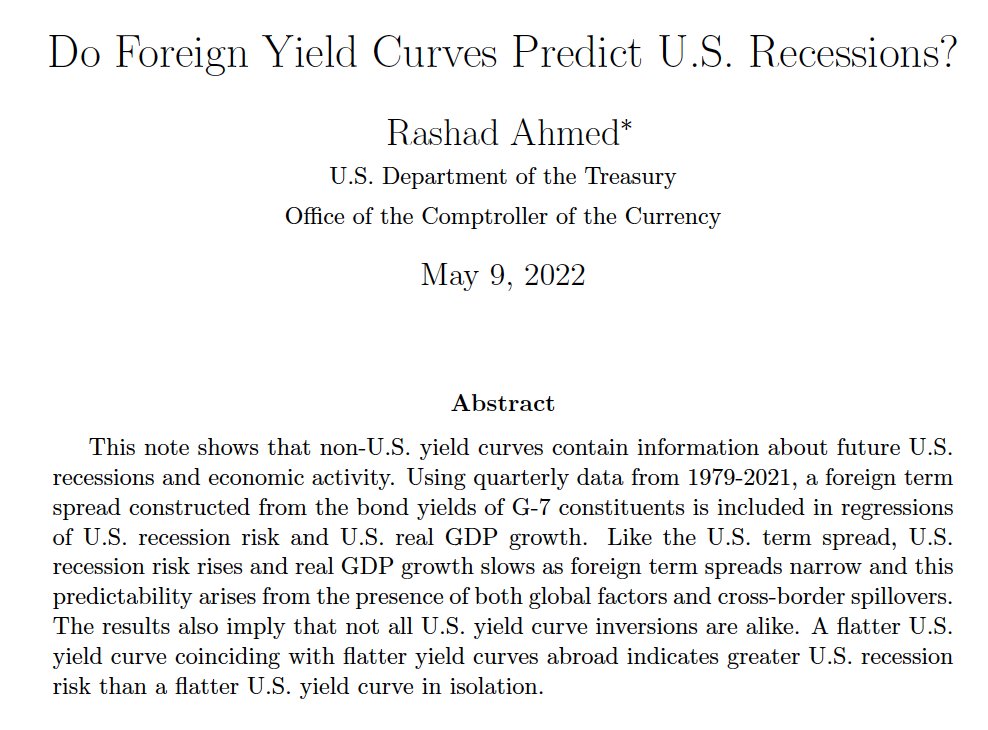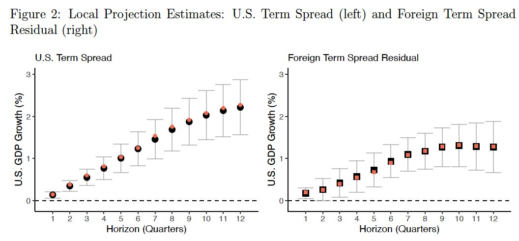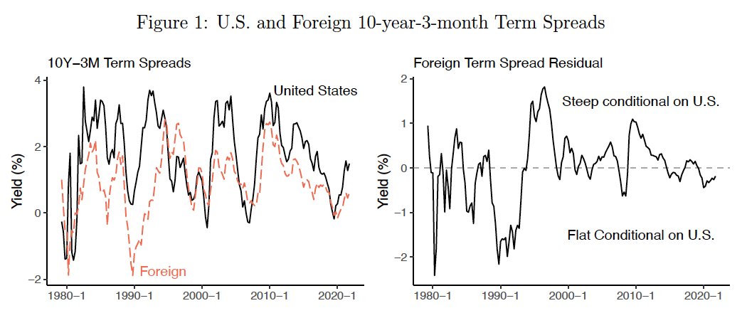 The short note shows that foreign term spreads (3m10s) constructed from non-US G7 constituents contain information about future US recessions *even after* accounting for the predictive content of the US term spread and several other leading indicators 2/5