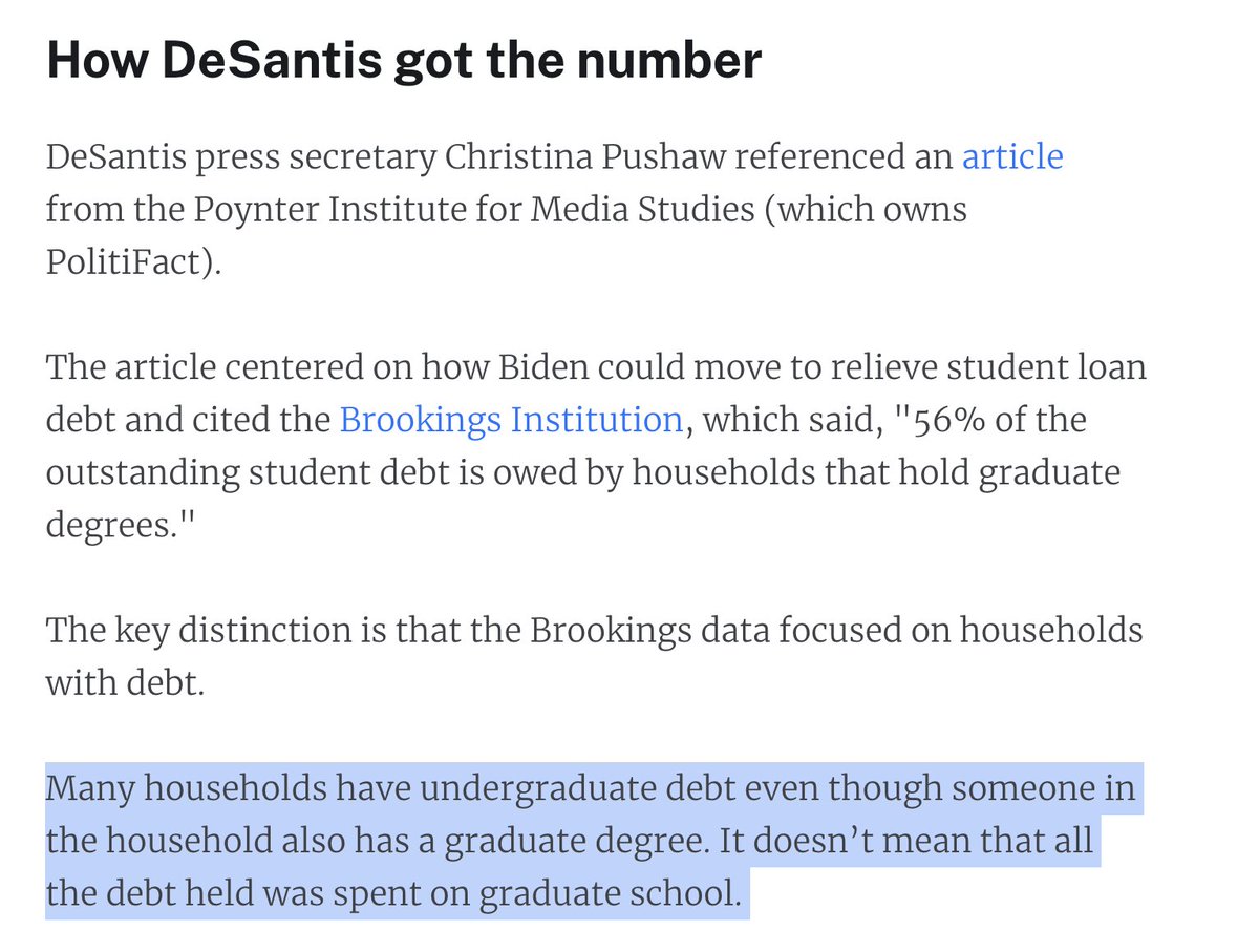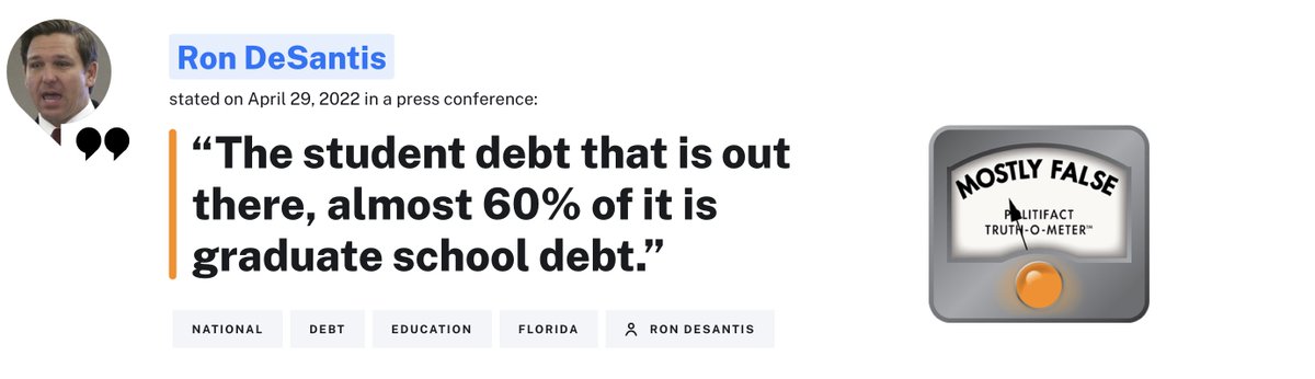 DeSantis says most student debt is graduate debt. PolitiFact says no, it's held by graduate degree holders, and includes their undergrad debt. So "Mostly False." Which ok, you took it overly literally and missed the point of the statement, which is most privileged hold most debt.