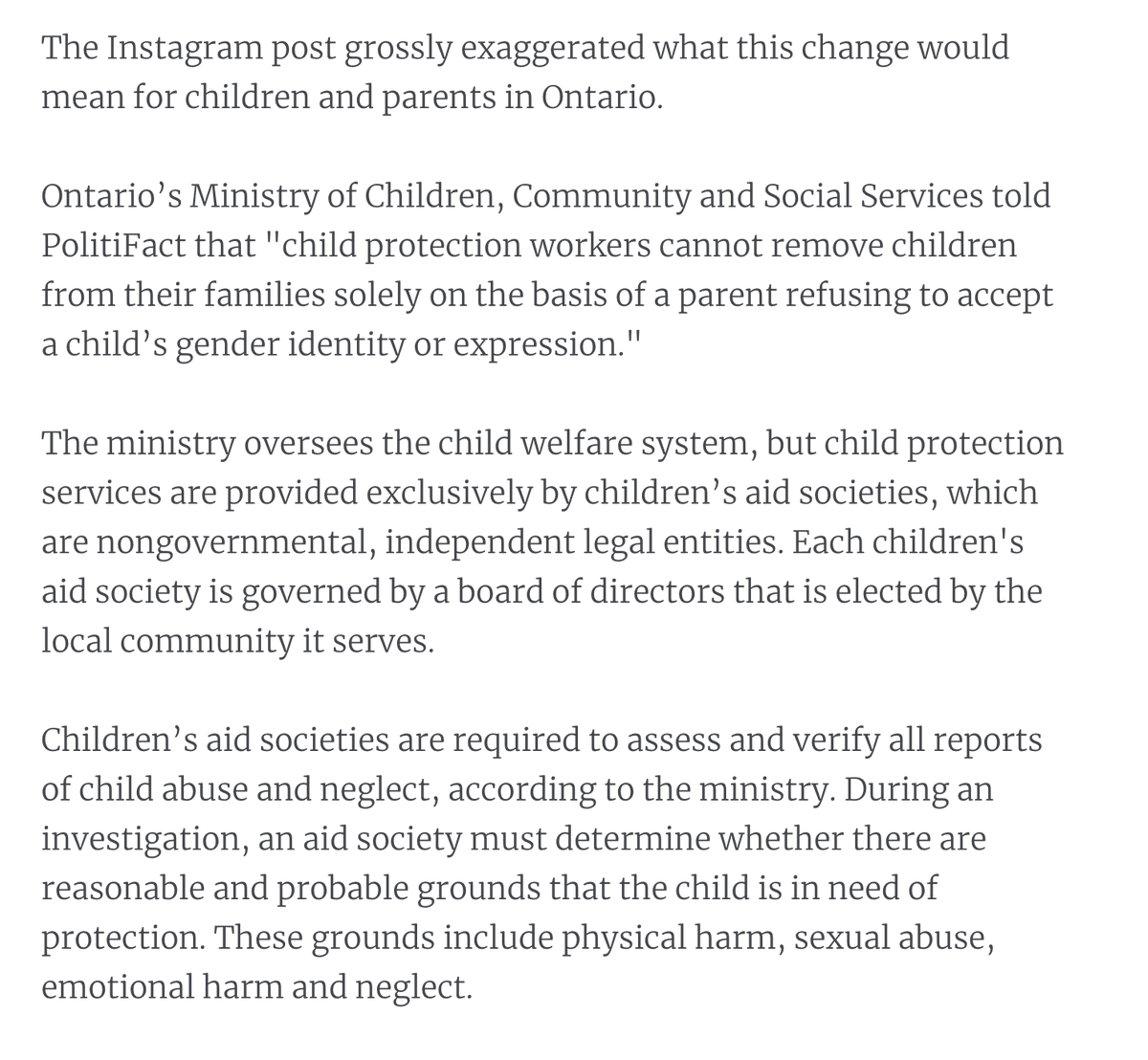 In this one they are responding to an Instagram post that says Canadian authorities can take your children away if you don't accept their "gender identity." This is rated as false because of a gov statement that gender identity can't be the "sole" reason for taking them away.