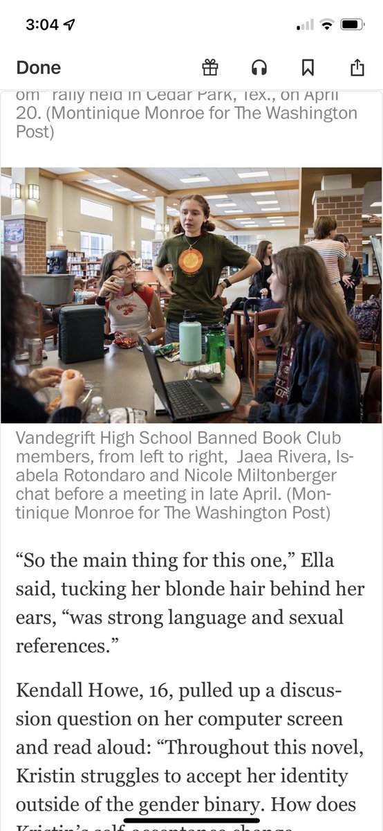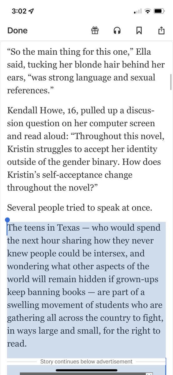 “The teens in Texas — who would spend the next hour sharing how they never knew people could be intersex, and wondering what other aspects of the world will remain hidden if grown-ups keep banning books — are part of a swelling movement of students”. It’s too much!