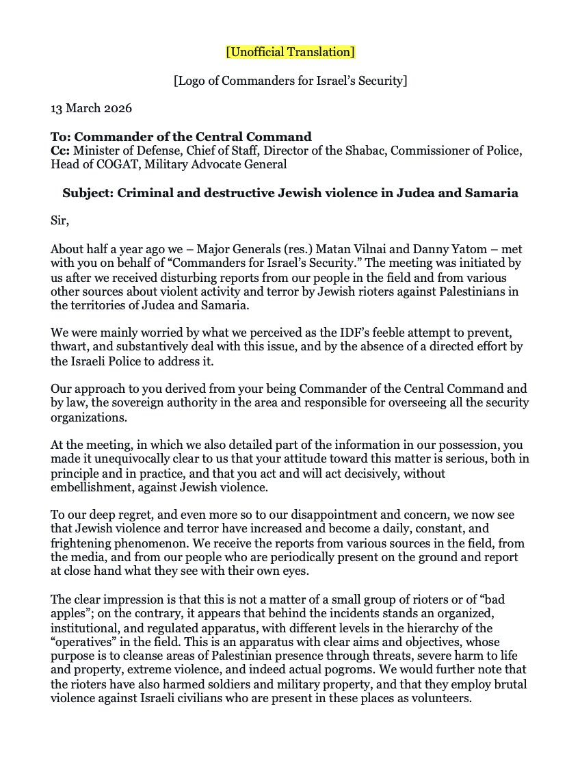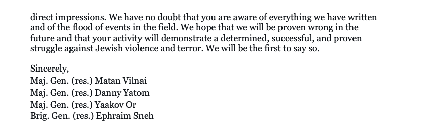 Commanders for Israel’s Security sent a letter on settler terrorism in the West Bank to the Central Command General. The letter was sent as a follow-up to a meeting 6 months prior.