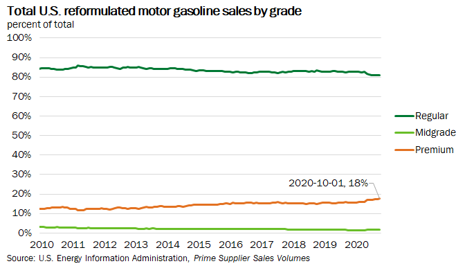 This means more cars likely say "Premium recommended" (i.e. to get EPA sticker numbers), and not "Premium Required". At the same time, the share of premium gasoline sales is rising - up to 13%, the highest it's been since ~2003, and have recovered faster than other grades.