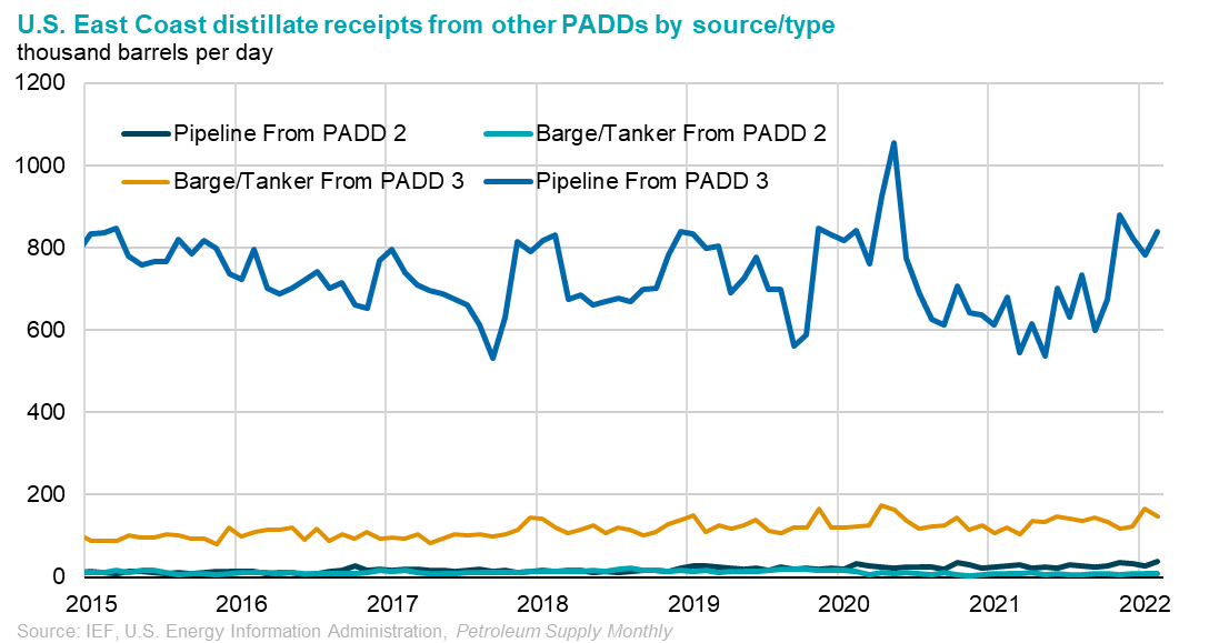 Looking at the PADD1 distillate supply/demand balance we can see that as in-region refinery production decreased due to refinery closures, PADD1 first relied on receipts (pipeline/tanker/barge) from other PADDs.