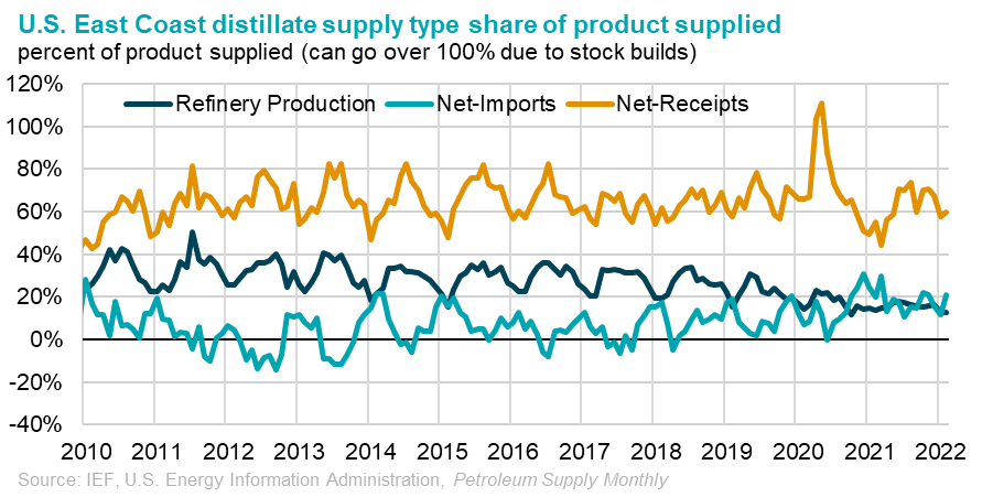 This reshuffling (refinery closures, pandemic, etc.) resulted in imports of distillate becoming a larger part of the East Coast's distillate supply. Which, when times are normal is ok, many countries/regions do it. However, things aren't "normal" nowadays are they?