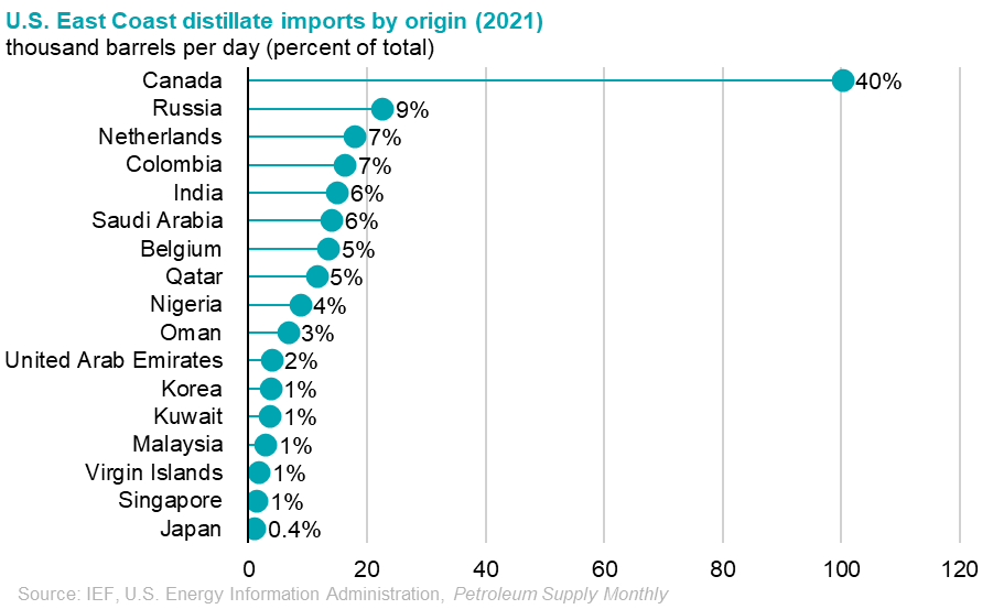 In 2021, imports from Canada represented 40% of total PADD1 distillate imports. But, look at #2: Russia with 9%, then Netherlands 7%, and a bit farther down Belgium 5%.