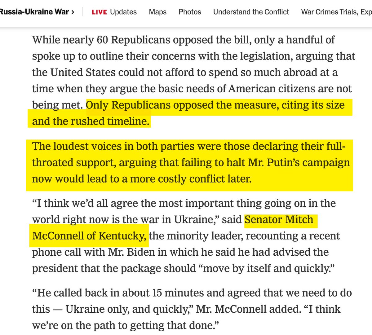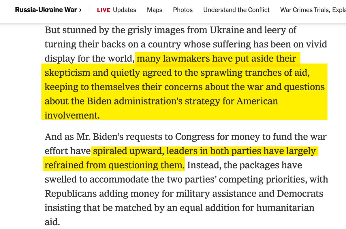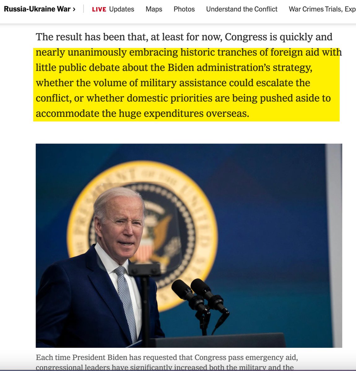 What's happening in DC seems to be a bridge too far even for NYT. In its report on Congress' approval of $40b more for the war in Ukraine - with every Dem voting YES - they note over and over: there is almost no questioning or debate over this escalation: