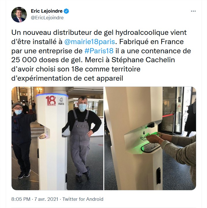 D'ailleurs M. Lejoindre a même commandé à cette société un distributeur de gel ultra-performant siglé "Mairie du 18e", en janvier 2021 (😁).