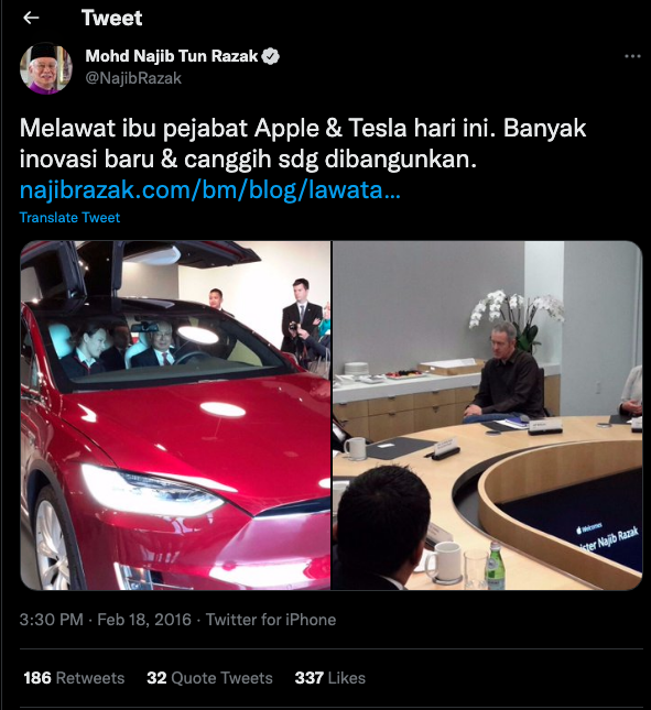 Sebelum PM Ismail Sabri, ex PM Najib Razak juga pernah ke US untuk melawat kilang Tesla pada tahun 2016.