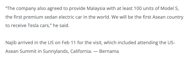 Hasil dari pertemuan tu, beliau mendapat persetujuan dari Tesla untuk bawak masuk 100 Tesla Model S, dan jadi negara pertama di ASEAN untuk memilikinya -