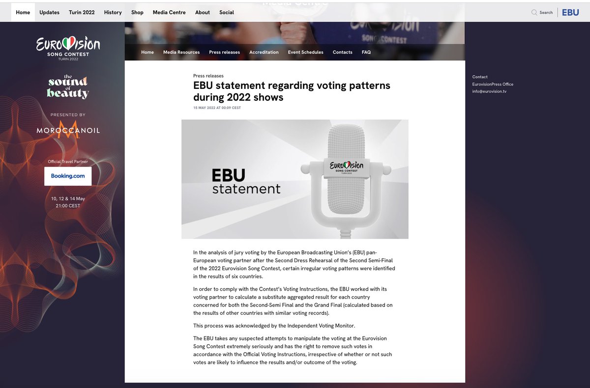 l’EBU, all'indomani della conclusione delle operazioni di voto, dopo la rehearsal per la finale, ha pubblicato una nota in cui faceva sapere che, analizzando i voti che le giurie dei singoli paesi avevano espresso, sono state riscontrate anomalie nel "pattern" dei voti.