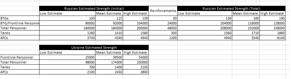 Starting strength: I kept the BTGs strength simple. There were ~13 tank BTGs. Used mean estimates for now. 🇺🇦 total personnel includes territorial defense. In general, I assumed 🇷🇺 BTG personnel are heavily engaged, but the rest aren't, a potential flaw in this quick analysis.