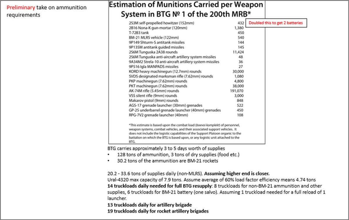 @KofmanMichael 7/ Ammo is far more heavy. A BTG carries roughly 3 days worth of ammo with it. Using a list provided by @kofmanmichael again, I came to a # of 128 tons of ammunition, + 3 tons of other supplies previously mentioned. Per day this is 43.6 tons, ~10 tons of this are BM-21 rockets.