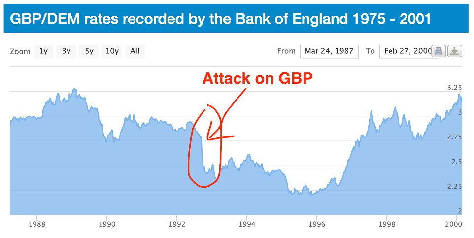 @laurashin Famous G. Soros attack on British pound in 1992 is similar in method to UST attack (i.e. if you believe there was indeed coordinated attack on UST/Luna). GBP ended up breaking its soft peg to Deutschmark, but only devalued 25% from peak to trough in 4 yrs.