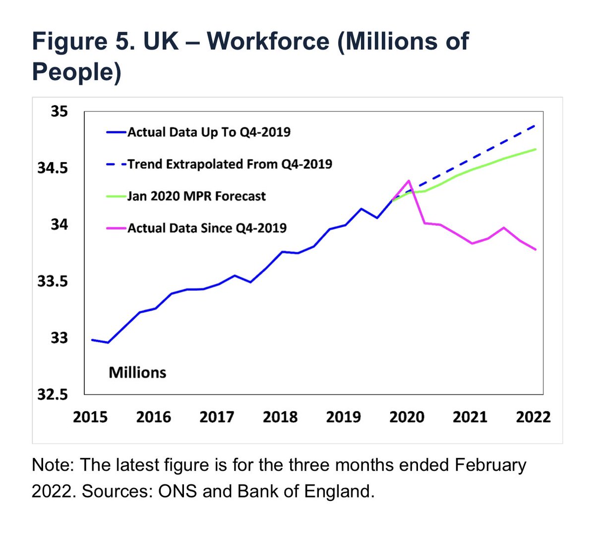 2) “Since Q4-19, the number of people aged 16-64 years that are outside the workforce and do not want a job has risen by 525,000 (1.3% of the 16-64 age population). This **largely reflects increases in long-term sickness** (roughly 320,000 people) and retirement (90,000),