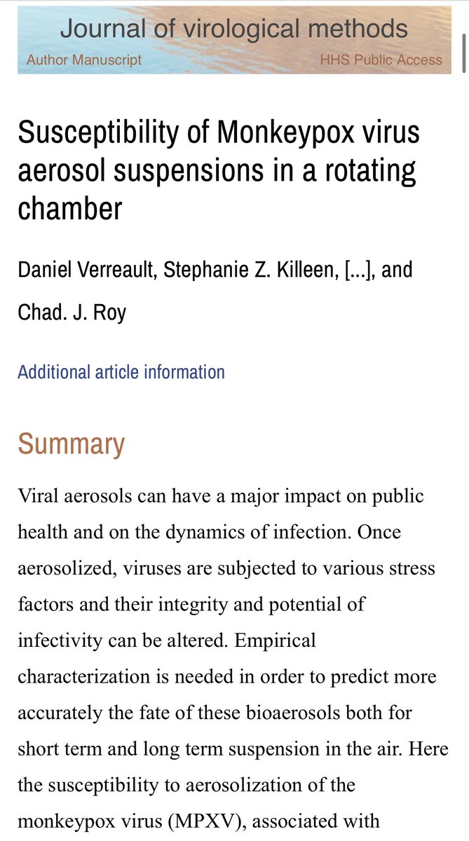 Crap—Monkeypox is likely aerosol airborne. Study indicates monkeypox is aerosol stable for up to 90 HOURS and remain infective during that time. I pray we’ve learned our lesson with #COVIDisAirborne and don’t repeat the droplet vs airborne 2 year nonsense. ncbi.nlm.nih.gov/pmc/articles/P…