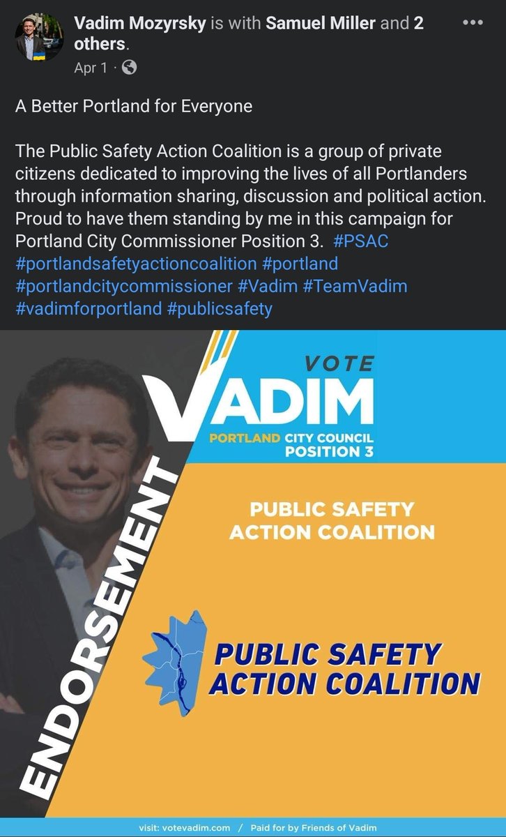 Vadim is a leader of Portland Safety Action Coalition(PSAC) & suprise his org endorsed him. Commander Erica Hurley told LNLA members to join PSAC at the same meeting she violated state election laws at. PSAC promotes PPB video on their website about police staffing "shortage" 5/