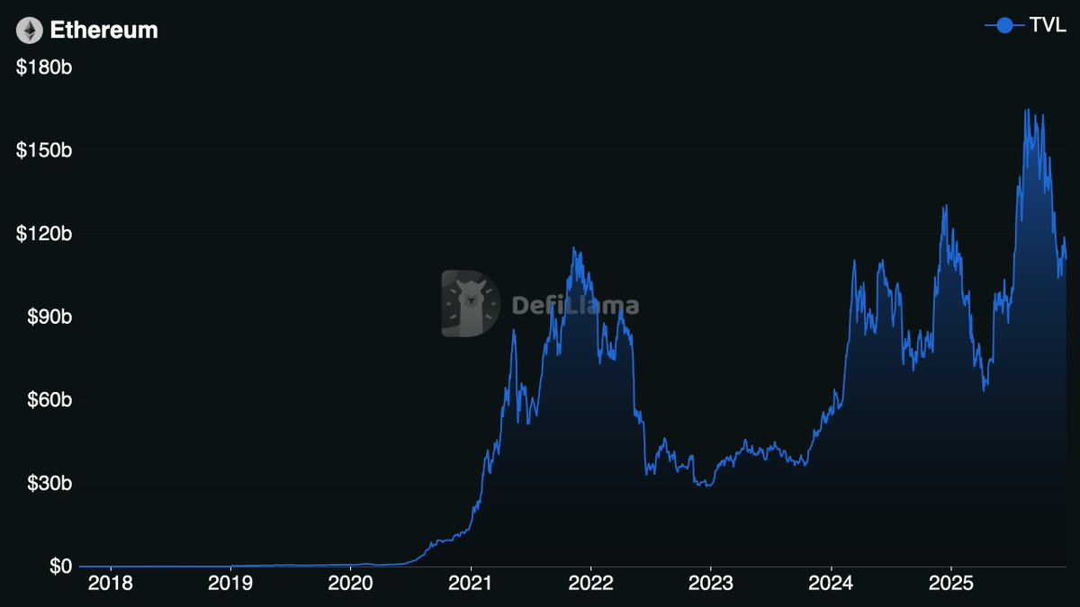 The headline figure: Ethereum TVL closes the year at ~$68.8B.