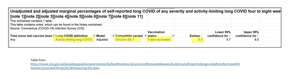 While vaccination is protective against Long Covid (cuts risks by maybe about half, hopefully reduces duration but not enough data yet), ONS nonetheless estimate that about 6% of people developed activity-limiting long covid after 3 vax doses from 1st Omicron infection. 6/8