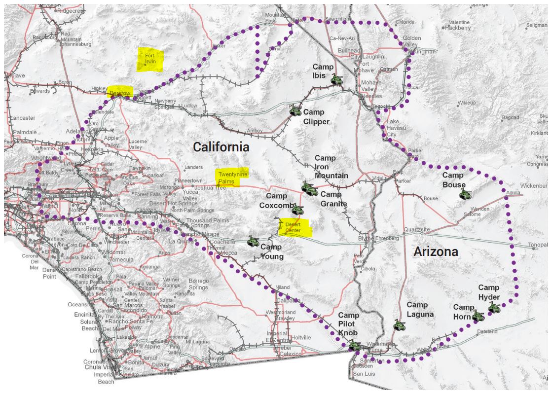 Maneuver Area “A” included: Camp Coxcomb, Camp Iron Mountain, Camp Granite, Camp Rice, Camp Ibis, Camp Pilot Knob, Camp Essex, and Camp Clipper.