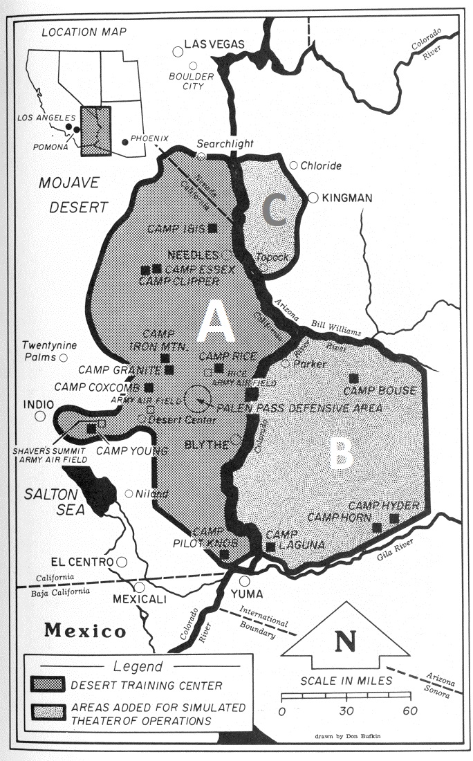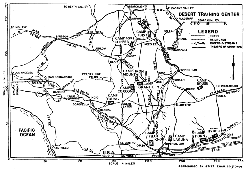 “The land was remote and rugged, and largely uninhabited which made for an excellent large scale training area. An existing aqueduct system (running from the Colorado River to Los Angeles) could easily supply troops with water.”