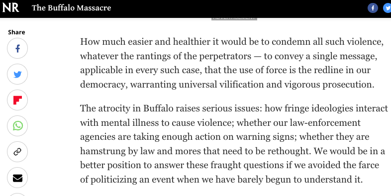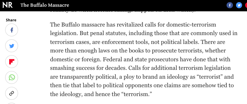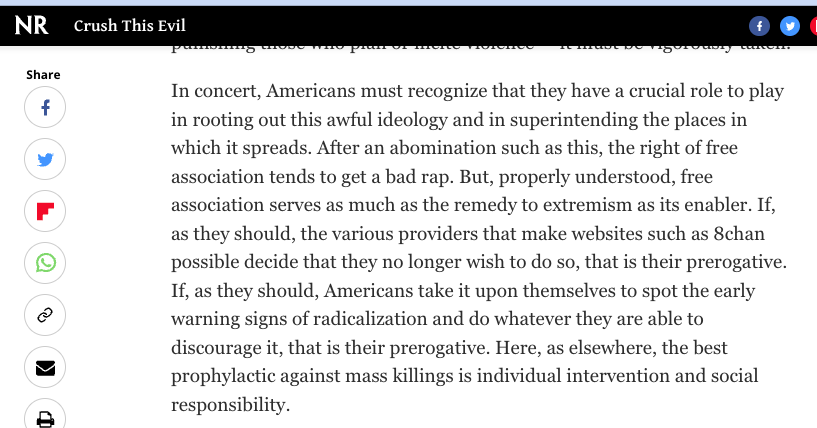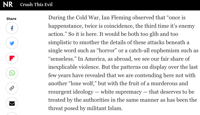 Striking trajectory for the editors of National Review on white supremacist massacres. After El Paso: Authorities should treat this as a threat on par with militant Islam, all Americans should help root out "this awful ideology"