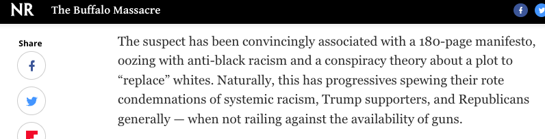 After Buffalo: Suspect believed in replacement "conspiracy theory" but Democrats are politicizing the event, Capitol rioters have been unfairly described as "white-supremacist" (the only use of the term in the piece), Biden won't condemn black racists.
