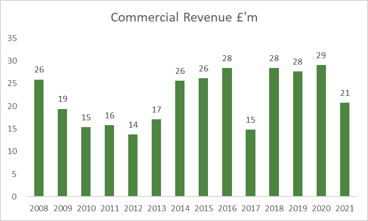Matchday revenue down 99% due to Covid. Even before Covid it had fallen by almost a quarter during the MA reign.