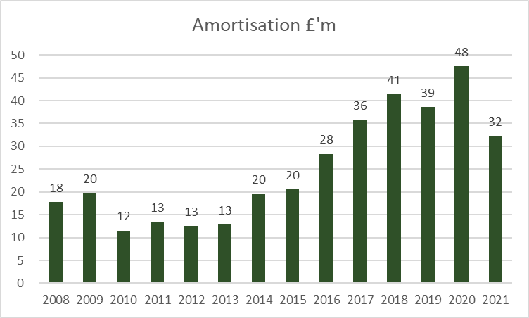 Other main cost relating to player is amortisation (transfer fees spread over contract length). This down by a third but mainly due to shorter accounting period and big write off of players in 2020.